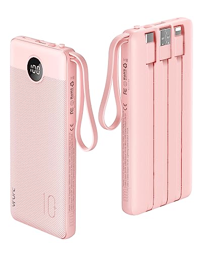 Specification: VRURC Portable Charger Power Bank, 10000mAh Travel Essentials Battery Pack, 5 Outputs 2 Inputs Slim Charging Bank Built-in Cables Cords Wires Compatible with iPhone,Samsung,Android-Pink(1 Pack)